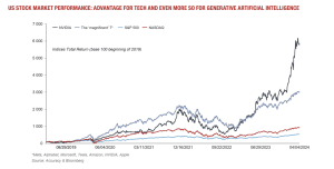 Les particuliers ne sont pas en reste. Selon les chiffres fournis par la société canadienne indépendante de recherche économique BCA, ChatGPT, l'un des pionniers des GAI, a franchi le seuil des 100 millions d'utilisateurs en deux mois. À titre de comparaison, il a fallu cinq ans à Facebook et un an à TikTok pour atteindre ce niveau. Les épargnants et les investisseurs sont sensibles au développement de cette technologie. Dans le cas américain, la performance boursière des actions concernées est d'autant plus impressionnante que le modèle d'affaires choisi intègre un développement important des GAI.