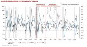 Deux remarques s'imposent. Tout d'abord, la littérature académique conclut que l'impact économique de la généralisation des RGE est incertain, en termes de productivité, d'emploi et donc de croissance. Il y a un manque de données et aussi un manque d'informations sur le soutien de politique économique qui devrait être mis en place. Deuxièmement, il est possible de remonter dans l'histoire et de rappeler les gains de productivité générés par les changements de technologie. Prenons le cas américain et dressons un tableau de l'évolution de la productivité aux États-Unis depuis la fin de la Seconde Guerre mondiale. La généralisation des ordinateurs personnels (dans les années 1980) et de l'internet (dans la décennie suivante) a entraîné une hausse de la productivité. Cette croissance n'a pas été particulièrement spectaculaire : si l'on exclut les périodes de récession, elle s'établit à +1,8% par an entre 1975 et 1979 ; +2,1% entre 1981 et 1988 (diffusion de l'ordinateur personnel) ; +2,4% entre 1989 et 2005 (diffusion de l'internet) ; +1,5% par la suite (entre 2006 et 2023).